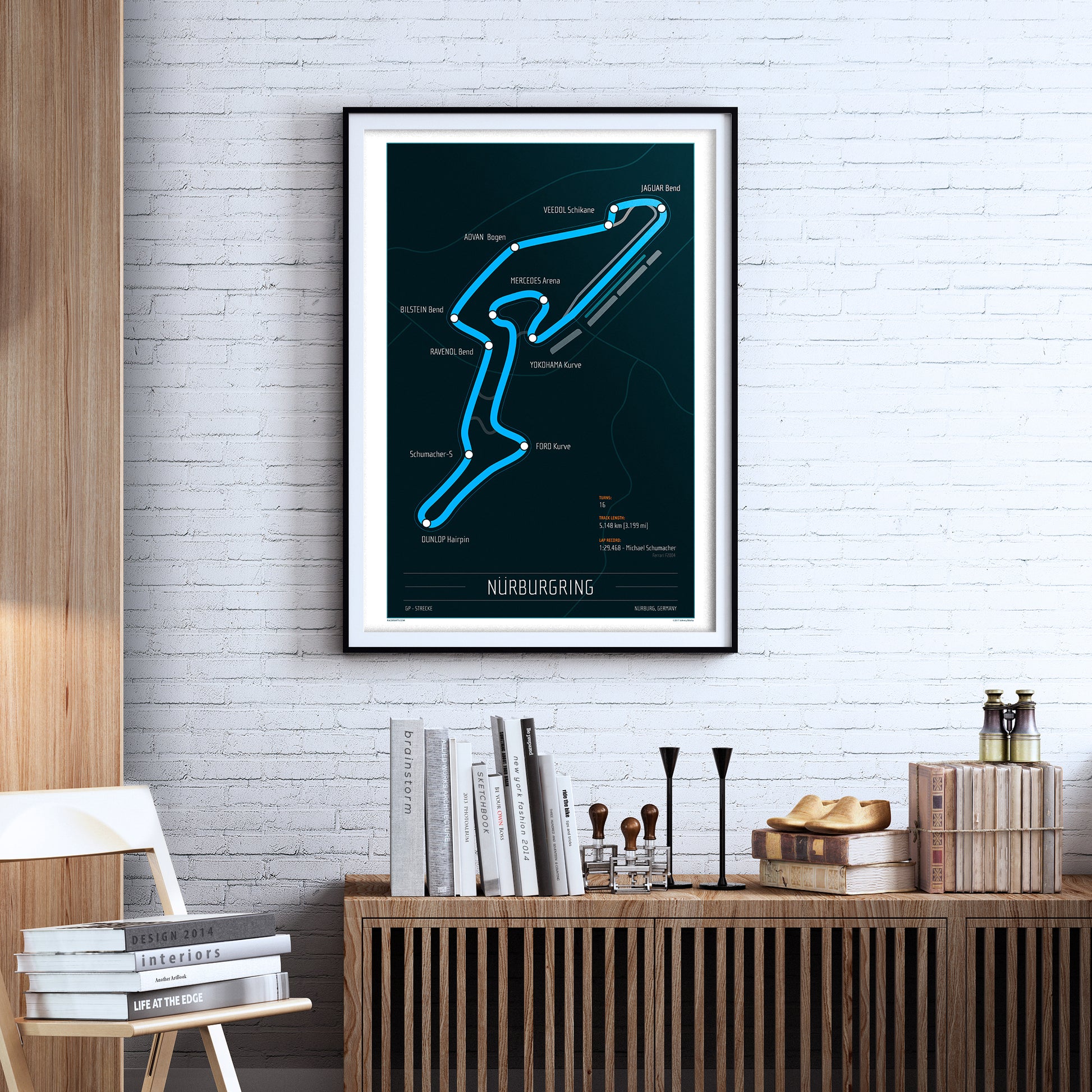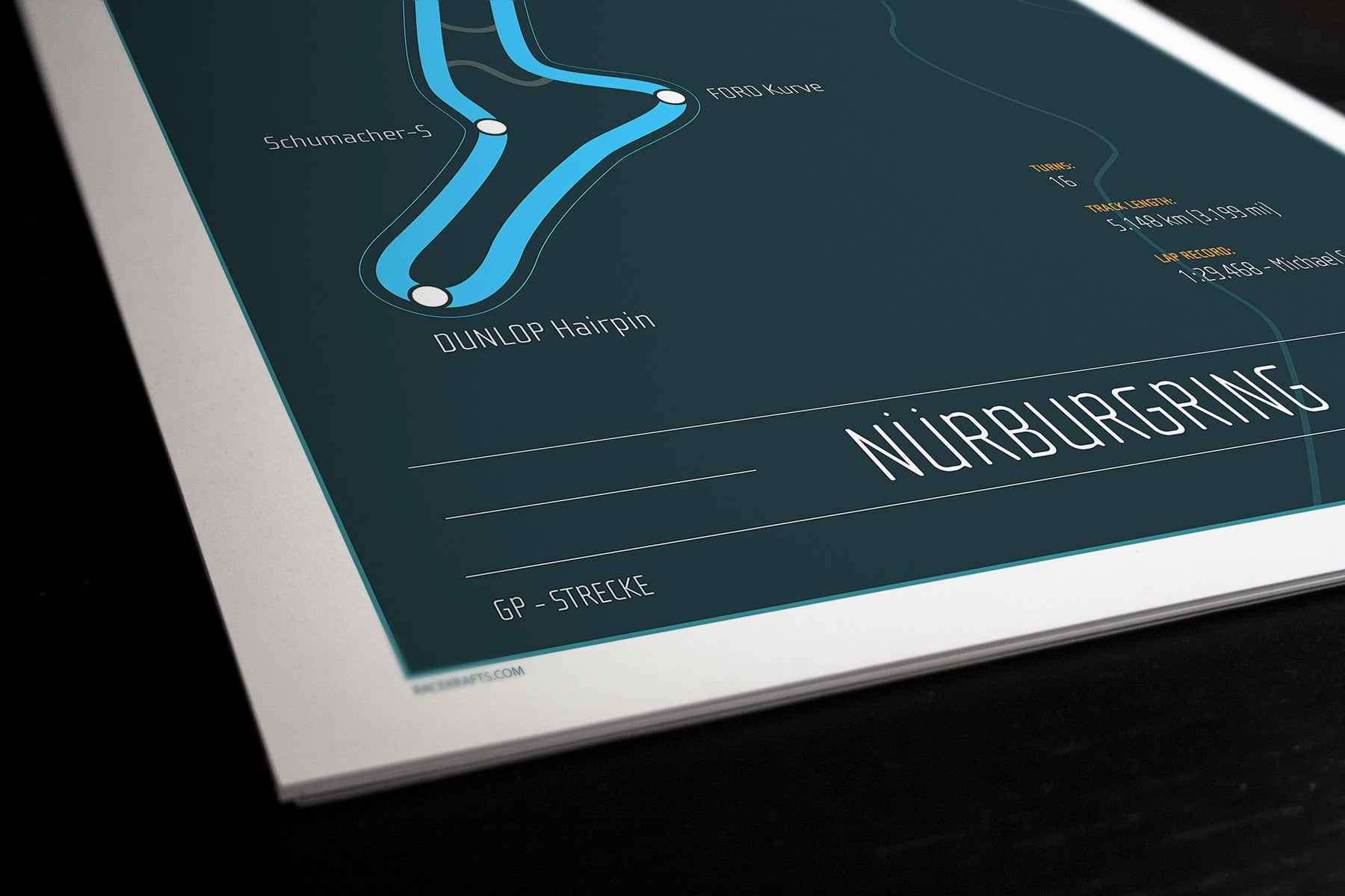 The name is one of the most recognizable in the world of performance automobiles. No matter what kind of car. The true test is how well it does at Nurburg. This track poster highlights the current Formula One Grand Prix Circuit. Notable turns are highlighted within a minimal but classic poster representation of this famous racetrack.